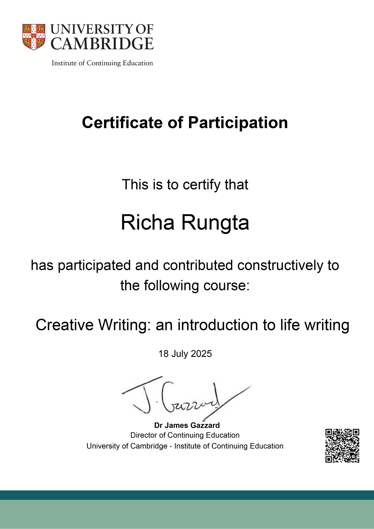 course, participating in every challenge, supporting fellow students, contributing